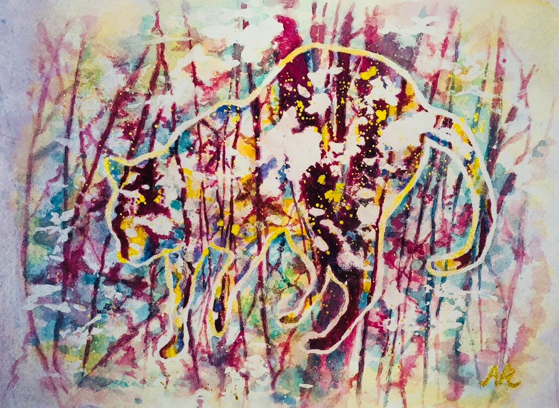 虚実の世界を 自由に生きる 宇宙猫。 水彩画